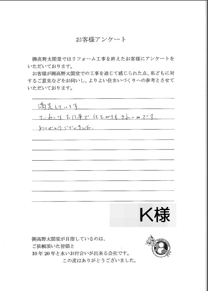 とのお話でした。 そのお気持ちに応えるべく、精一杯対応させていただきました。 『作業にくる方たちが、皆いい人ばかりだったわ』とのこと。 ありがとうございます。 |