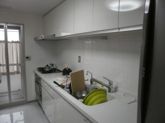 | 施工内容 | キッチンリフォーム、壁・天井クロス張替、ジュータン張替、 キッチン・トイレ・洗面所床張替、ドア・ドア枠ダイノックシート張り |
