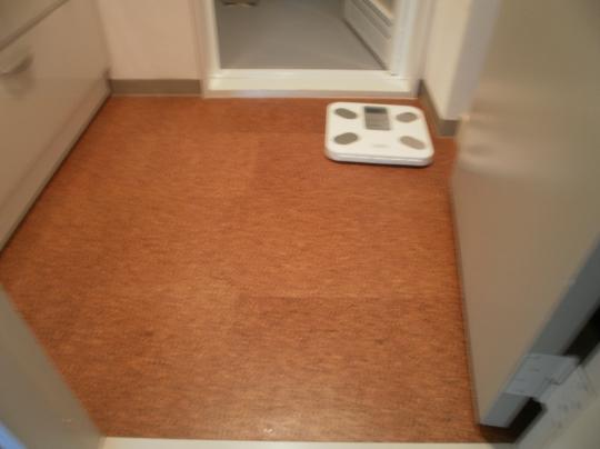 | 洗面所とトイレの床です。洗面所はコルクの床でした。 こちらも真っ白なビニル床タイルに張替えます。 |