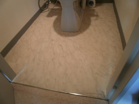 | 下地が乾いたところで、真っ白なビニル床タイルを張っていきます。上品なマーブル柄で タイルの継ぎ目も全く目立ちません。 |
