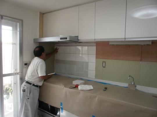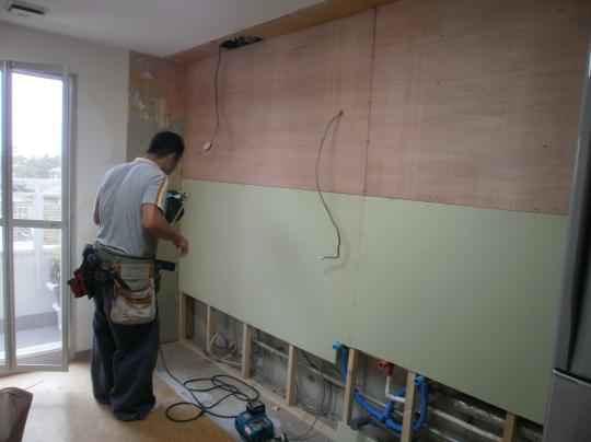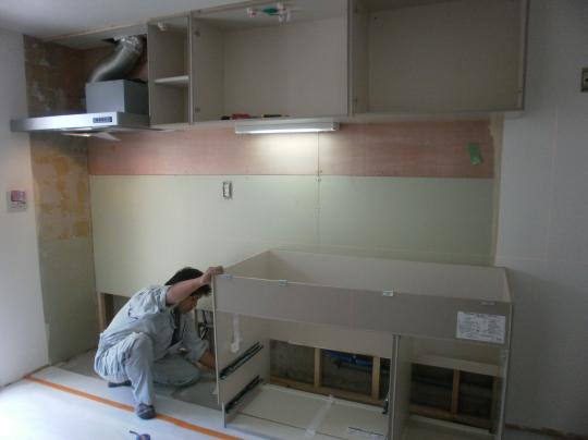 | キッチン裏に新規の壁をつくりました。 | 新しいキッチンを組み立てているところです。 既に換気扇はついていますね。 新しい換気扇はシロッコファンでお掃除も楽です。 |