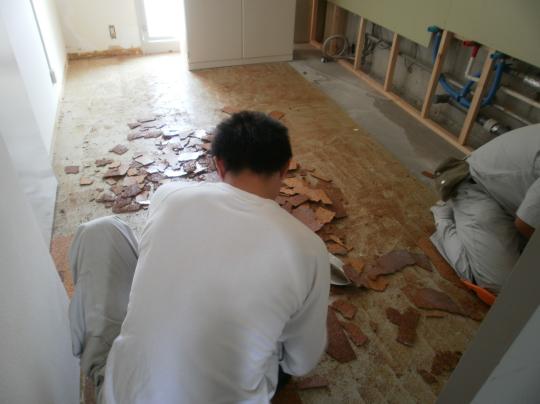 | キッチンの床のリフォームの様子です。 既存のコルクを剥がしているところですが スペースの関係上、手作業で行ったため 時間がかかりました。 |