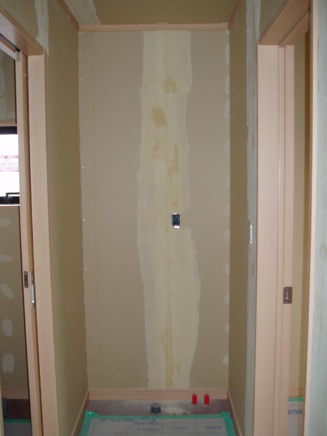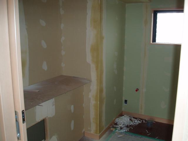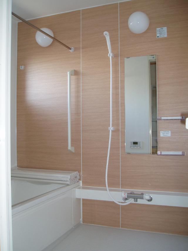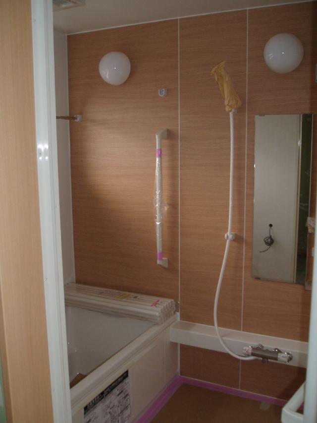 | パテを塗った後の壁面です。 | 浴室が完成していました。 木目調で素敵ですよね。 |