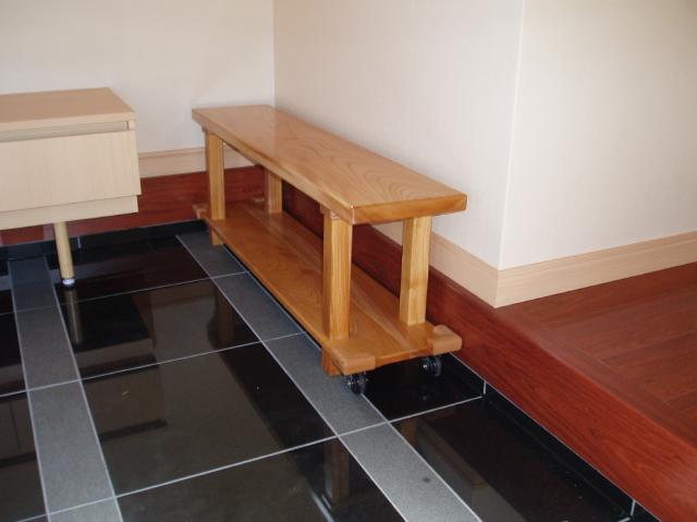 | 玄関でこんな素敵な台を発見しました。 下にキャスターが付いているのですが、 座ると安定する仕掛けになっているそうです。 |