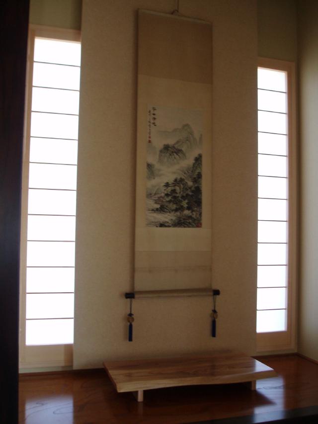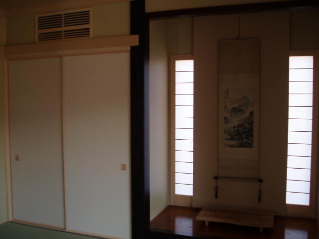 | 床の間は壁を一枚ふかし、両脇に細長い障子を 入れました。この障子は取外しも出来ます。 |