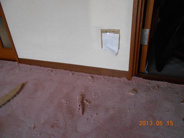 | 25年前に貼った既存のカーペットを剥がし終わったところです。残った毛を丁寧に取り除いていきます。 |