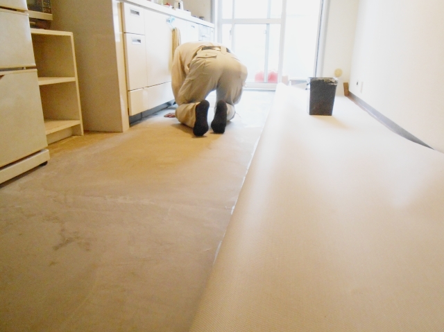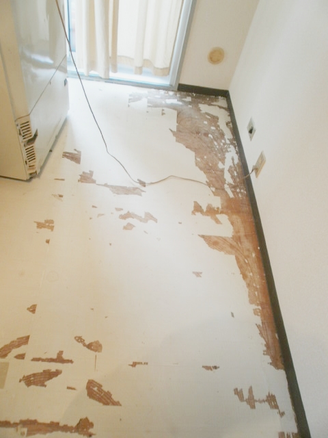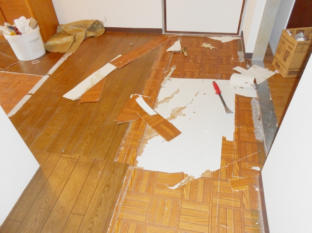 | 洋室:既存の床を剥がしていきます。 | 洋室に使用するのは、メーカーリリカラの 直貼り遮音フローリングリリカラウッドです。 抗菌加工・クラック防止加工・F☆☆☆☆(JAS) 規格適合・ホットカーペット対応です。 |