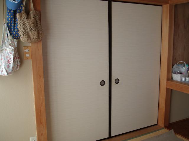 | 施工内容 | 吊り襖を木を使用した建具に交換、白木の大小の引手の使用、戸襖の交換 |