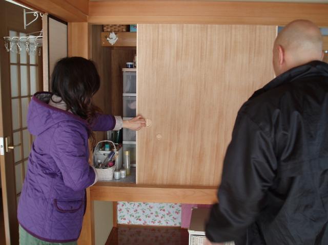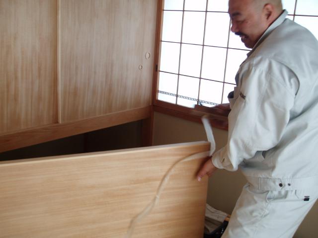 | 戸襖も同様に、『かんな』で削っては、はめて・・・を繰りかえしながら微調整を行います。 まだ、戸襖のリビング側にクロスを張る前に調整しているので、下地が見えていますね。 |