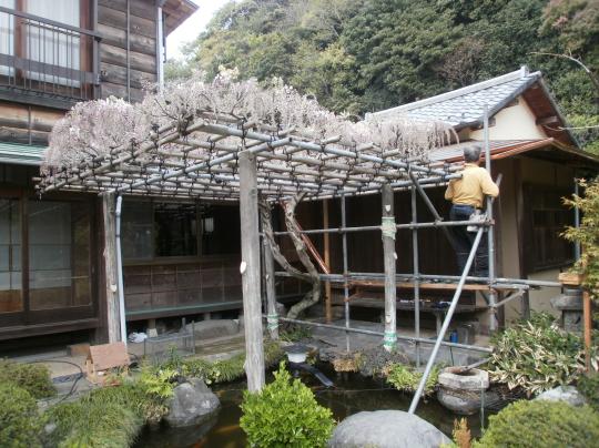 | お施主様宅の外観です。 広大な敷地のなかに趣ある佇まいです。 池には藤棚が・・・。満開の頃にはきっときれいでしょうね。 |