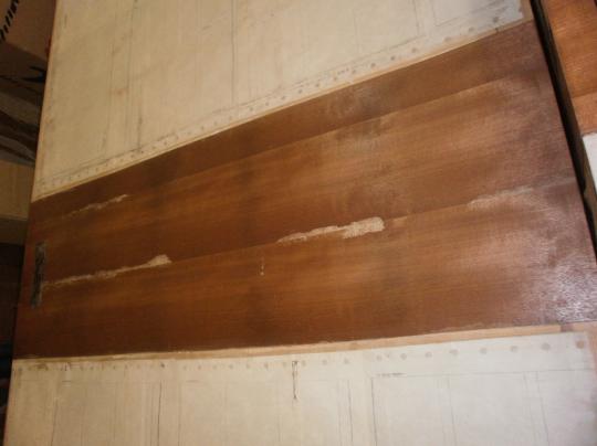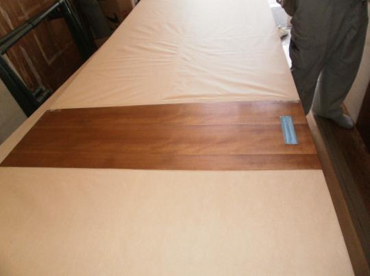 ダイノックシートを貼る木部の部分に シーラーを塗っている所です。 ダイノックシートの接着をよくします。 また、襖の部分の下張りも終えています。 |