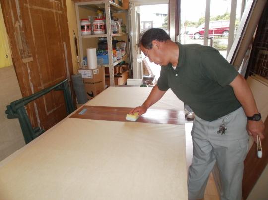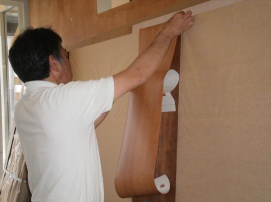 新しい木目調のダイノックシートを貼っているところです。貼り終えると、全くきれいに生まれ変わります! |