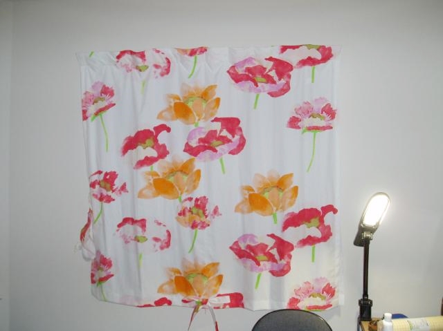 | 花柄のレースのカーテンに、光沢のあるグリーンのドレープ。まるでお花畑のようですね。 |